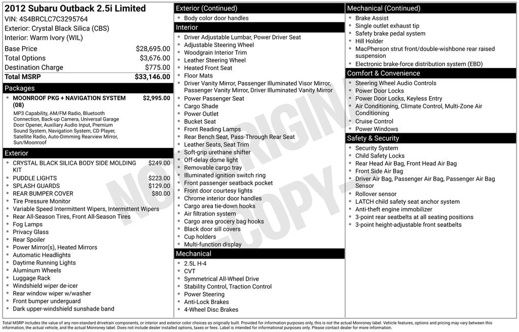 **Accident Free**2012**Subaru**Outback**Limited**AWD**Sunroof**Navigation**Heated Seats**Leather Seats**